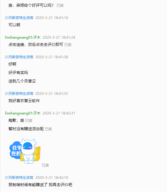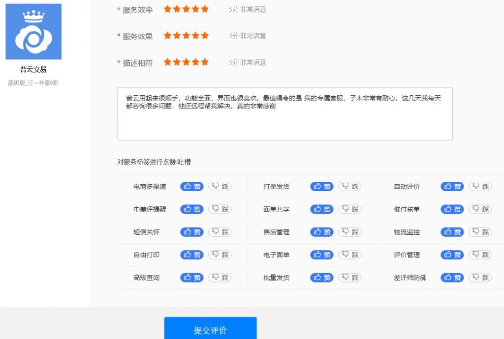 當他(tā)回複“謝(xiè)謝(xiè)老(lǎo)闆”的(¶de)時(shí)候,我會(huì)心一(yī)笑(xiào),不(bù)愧是(shì)普雲交易高₹(gāo)級版的(de)用(yòng)戶,眼光(guāng)好(hǎo),素質還(hái↓)高(gāo),心裡(lǐ)美(měi)滋滋。還(hái)給他(tā)發了(le)評價鏈接,想著(zhe)我服務這(zhè)麽好(hǎo)給個(gè)好(hǎo)評吧(ba)。結果:
